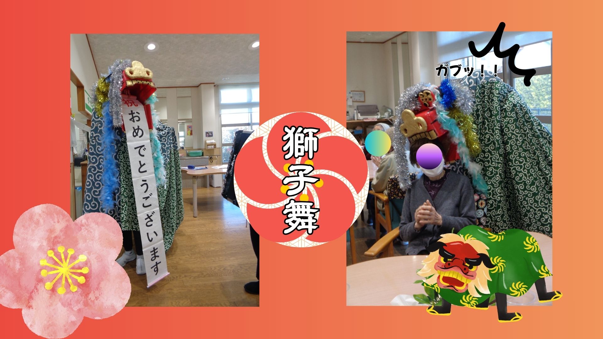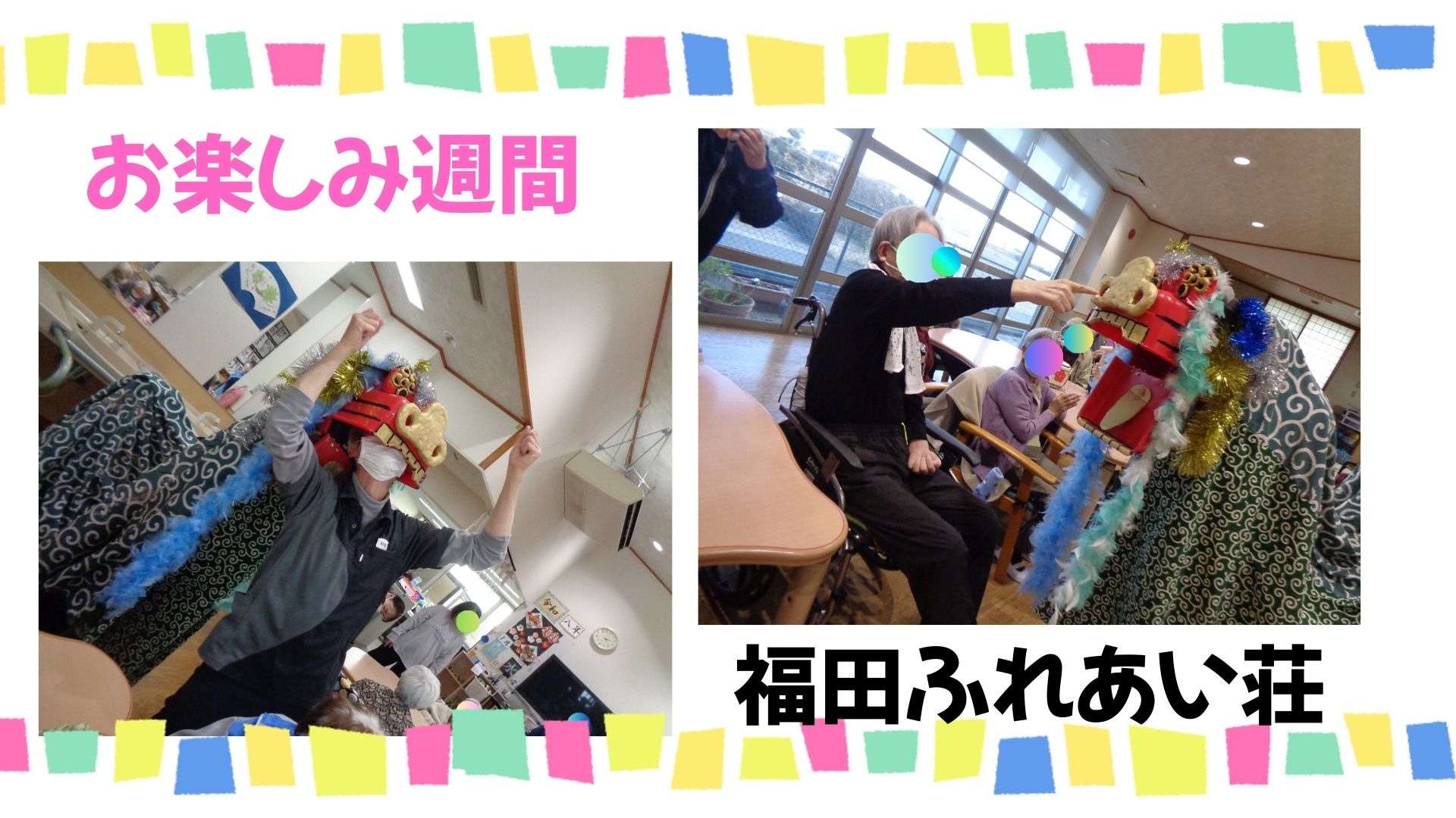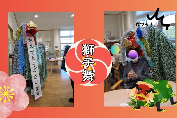 14日には獅子舞が豊田ゆうあいの里から来てくれ、ご利用者様の頭をかじっていました。