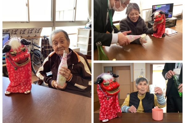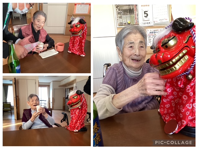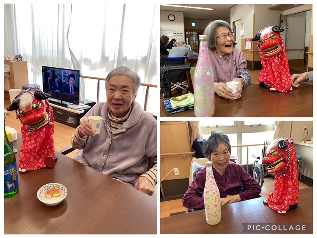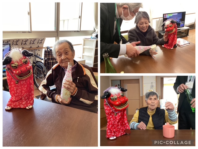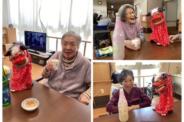 1月5日には、施設長が、新年のご挨拶とお屠蘇振舞いのため、各ユニットを回りました。 お酒が苦手な方は、獅子舞と一緒にお正月気分で写真を…。
