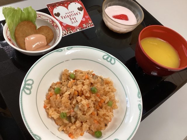 ハートのコロッケは、見た目がかわいく思わず笑顔になりました。 チキンライスの鮮やかな色合いとパンプキンポタージュのほっこり甘い味わいがよく合って、 食卓が一気に“バレンタイン気分”に。デザートのいちごムースは、ふんわり軽くて、 何よりも先に召し上がる利用者様がたくさんいました。