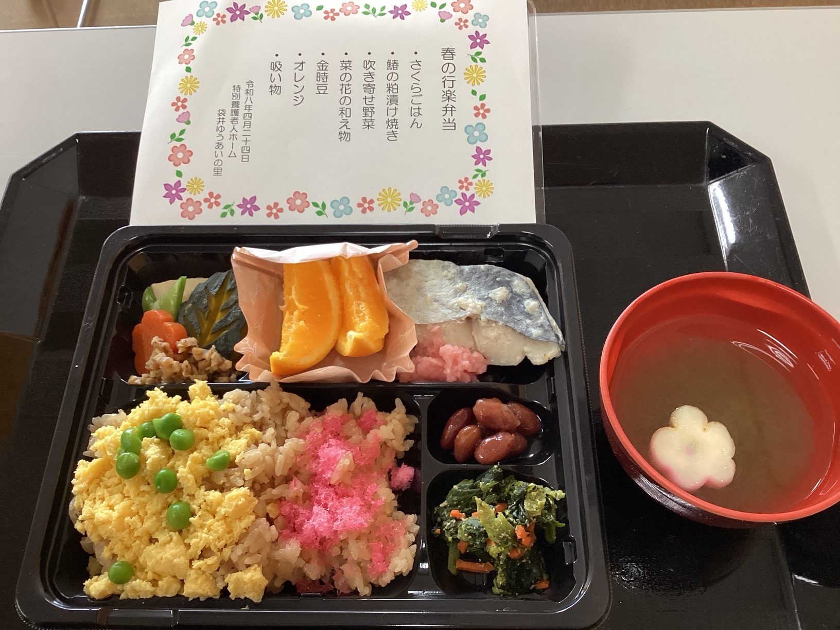 春の行楽シーズンに合わせて、本日は「春の行楽弁当」をご用意しました。 そぼろご飯に鰆の粕漬け焼き、吹き寄せ野菜、金時豆、菜の花の和え物 オレンジ、お吸い物と春の味覚をぎゅっと詰め込んだ特別メニューです。