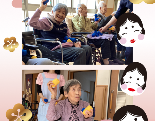 利用者様、豆代わりの玉を「鬼は外。福は内。」と言いながら、 一生懸命、鬼に向かって投げてくれました。 利用者様に交じって、職員も玉を投げ、豆まきを楽しみました。